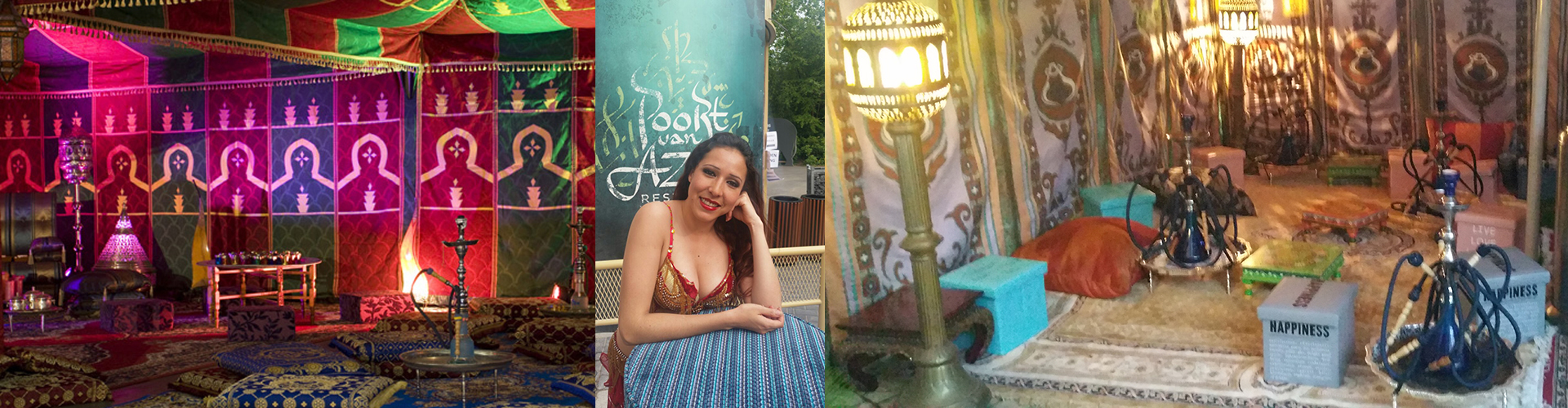 Breng Cairo, Marrakesh of Istanbul naar uw feest! Met bedoeïenententen, tapijten, grote kussens in fleurige kleuren, koperen Kasba-lampen, kleine tafeltjes met wierook, diverse waterpijpen en tal van waslijnen waaraan allerlei hippie-producten (zogenaamd) te koop worden aangeboden: kleedjes, strohoeden, tierelantijntjes, enz. Wij kunnen een Arabische markt en een bedoeïenendorp organiseren als decoratie voor uw feest. Mensen kunnen gewoon gezellig op de kussens zitten, en buikdanseressen dansen op mooie Arabische muziek.